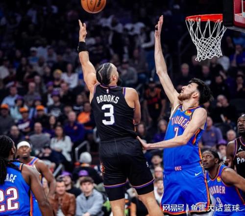 第三节比赛杰威罚球得分,可之后布克频频突到内线得分不说,吉莱斯皮也命中三分,马威内线得分后太阳追平比分,亚历山大命中三分后布克造成杀伤罚球得分,接下来亚历山大、霍姆格伦能够得分,但是马威也在内线得分,布克继续造成杀伤罚球得分,加上狄龙的发挥太阳咬住比分,可之后太阳进攻停滞,米切尔、亚历山大趁机打出一波8-2,末尾阶段太阳打出一波12-3,三节比赛结束太阳反超1分。第四节比赛维金斯、霍姆格伦帮助雷霆完成反超,关键时刻古德温命中三分,雷霆一波6-0后狄龙命中三分,杰威内线得分后古德温又命中三分,接下来两队打得激烈,古德温、狄龙帮助太阳紧追比分,末尾阶段布克、狄龙和古德温更是帮助太阳反超比分,虽然后面霍姆格伦、杰威追平比分,可后续布克命中三分,最终雷霆大爆冷输给太阳。
