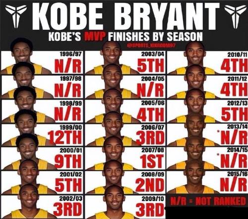 如果说科比生涯还有什么遗憾的话,那生涯仅拿过1次MVP肯定会在这个列表之中。