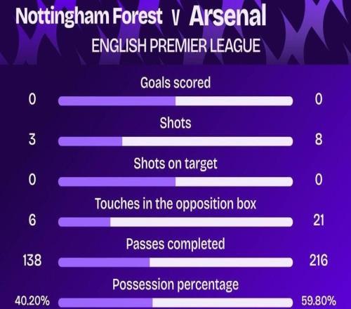 状态不佳,阿森纳对阵森林上半场8脚射门0射正