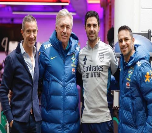 巴西队在阿森纳基地训练,安切洛蒂与阿尔特塔会面并合影